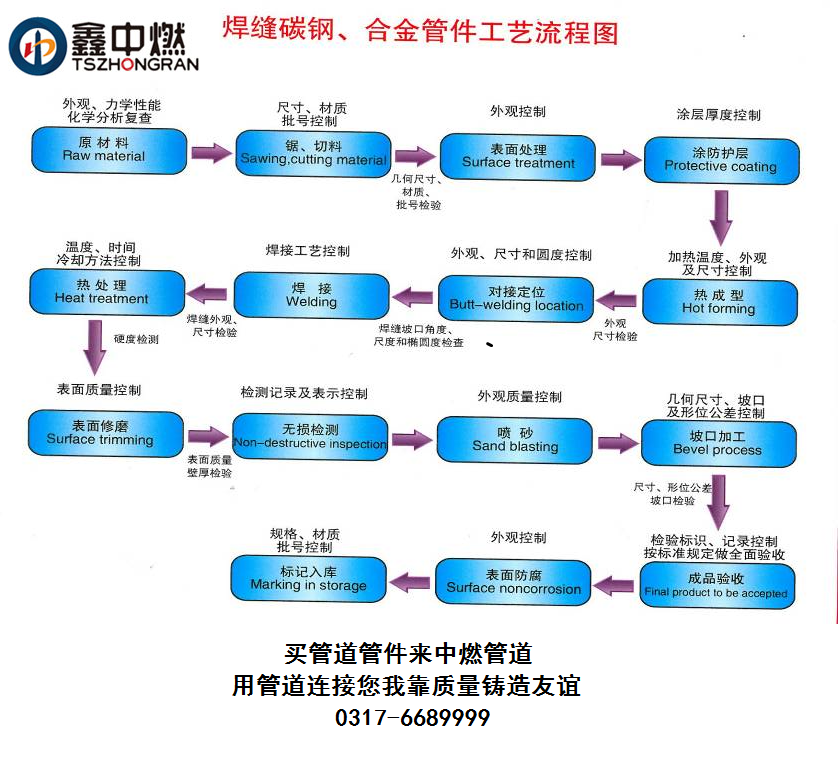 焊缝碳钢、合金钢管件生产工艺简易流程图: