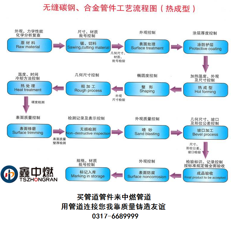 无缝碳钢、合金钢管件管件(热成型)生产工艺简易流程图: